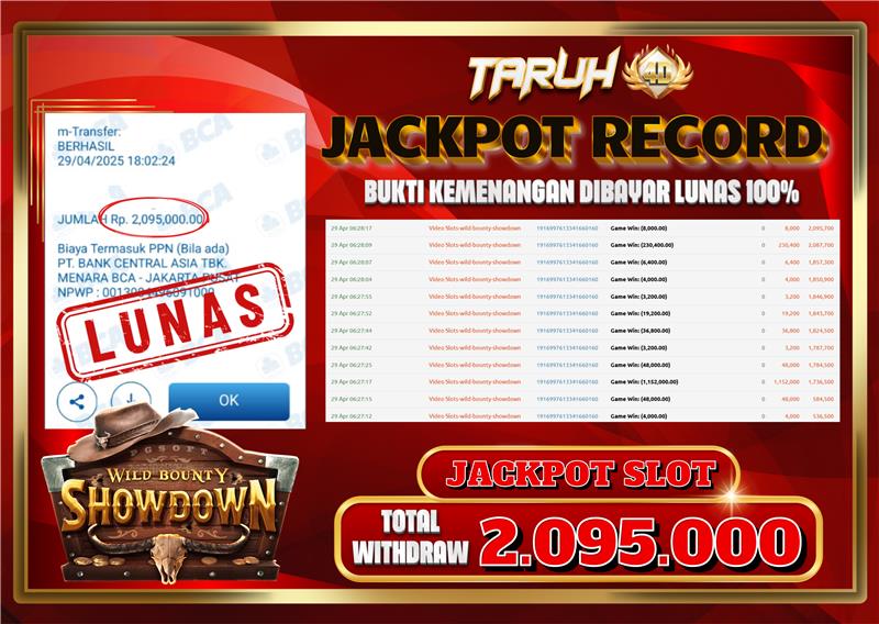 Selamat kepada User id : A****00 Telah berhasil mendapatkan kemenangan besar pada permainan slot WILD BOUNTY SHOWDOWN  kemenangan Sebesar Rp.2.095.000, Setelah mengisi formulir withdraw dengan kurung waktu hanya 5 – 10 menit pihak taruh4d sudah melakukan transfer kepada pemilik Userid dan dana sudah dapat di cairkan oleh pemenang. Bukti pembayaran yang kami berikan merupakan bukti pembayaran yang SAH / VALID yang langung di dapatkan melalui tanda transfer transaksi dari Bank yang di tuju.