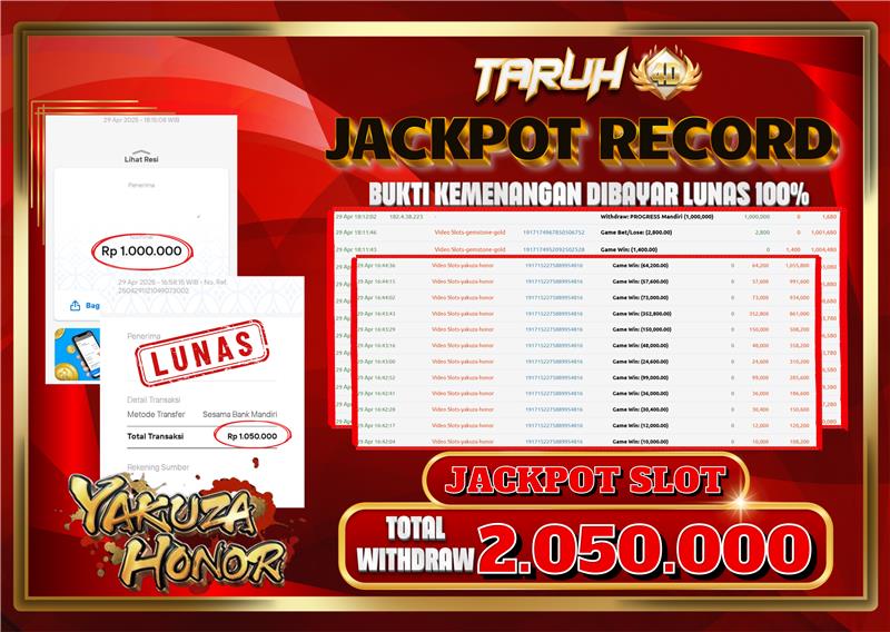 Selamat kepada User id : S****L Telah berhasil mendapatkan kemenangan besar pada permainan slot YAKUZA HONOR kemenangan Sebesar Rp.2.050.000, Setelah mengisi formulir withdraw dengan kurung waktu hanya 5 – 10 menit pihak taruh4d sudah melakukan transfer kepada pemilik Userid dan dana sudah dapat di cairkan oleh pemenang. Bukti pembayaran yang kami berikan merupakan bukti pembayaran yang SAH / VALID yang langung di dapatkan melalui tanda transfer transaksi dari Bank yang di tuju.