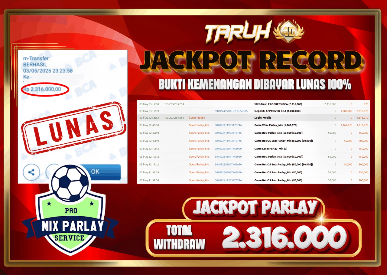 Selamat kepada User id : L****51 Telah berhasil mendapatkan kemenangan besar pada permainan bola SBOBET kemenangan Sebesar Rp.2.316.000, Setelah mengisi formulir withdraw dengan kurung waktu hanya 5 – 10 menit pihak taruh4d sudah melakukan transfer kepada pemilik Userid dan dana sudah dapat di cairkan oleh pemenang. Bukti pembayaran yang kami berikan merupakan bukti pembayaran yang SAH / VALID yang langung di dapatkan melalui tanda transfer transaksi dari Bank yang di tuju.