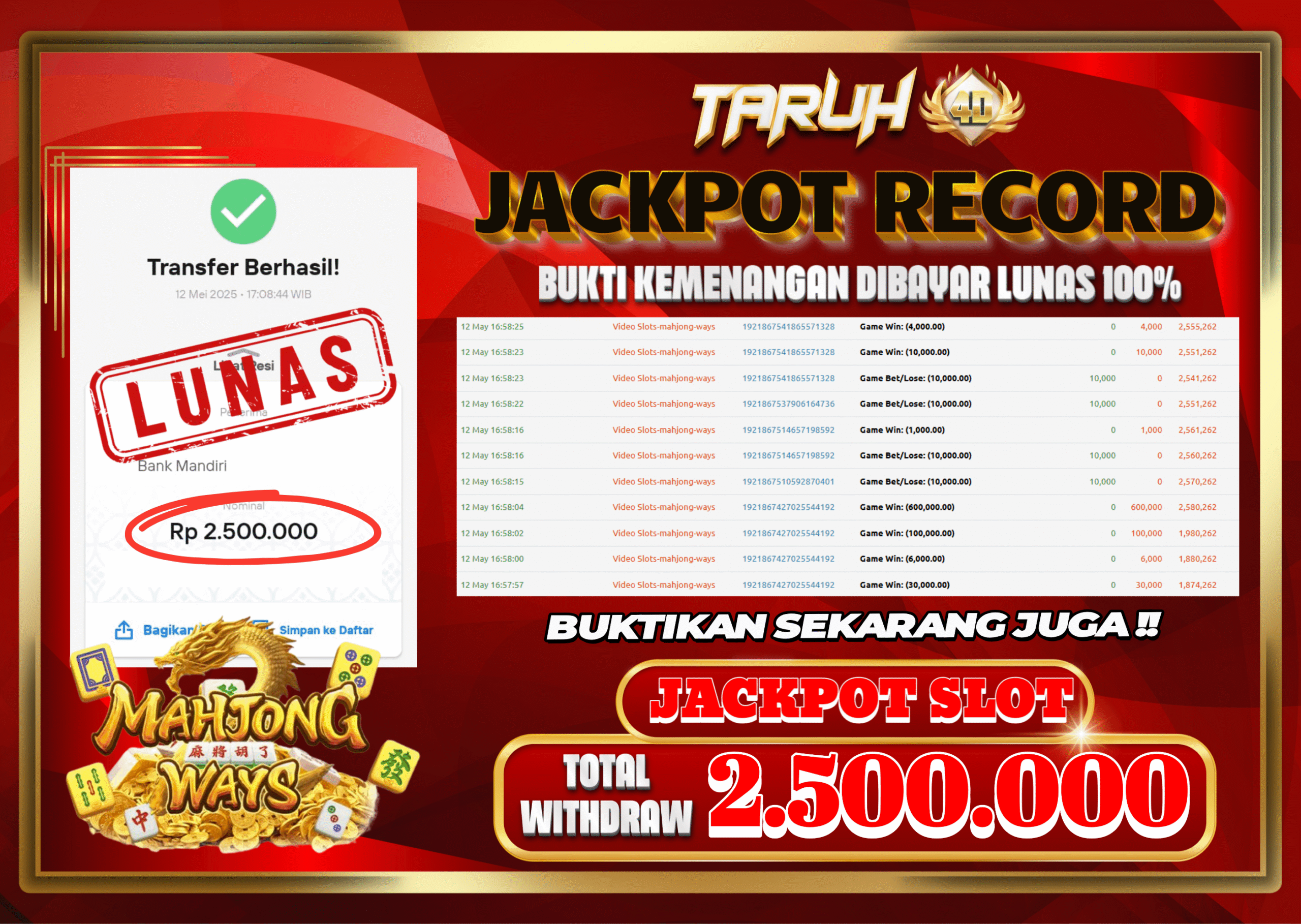 Selamat kepada User id : S****UL Telah berhasil mendapatkan kemenangan besar pada permainan slot MAHJONG WAYS kemenangan Sebesar Rp.2.500.000, Setelah mengisi formulir withdraw dengan kurung waktu hanya 5 – 10 menit pihak taruh4d sudah melakukan transfer kepada pemilik Userid dan dana sudah dapat di cairkan oleh pemenang. Bukti pembayaran yang kami berikan merupakan bukti pembayaran yang SAH / VALID yang langung di dapatkan melalui tanda transfer transaksi dari Bank yang di tuju.