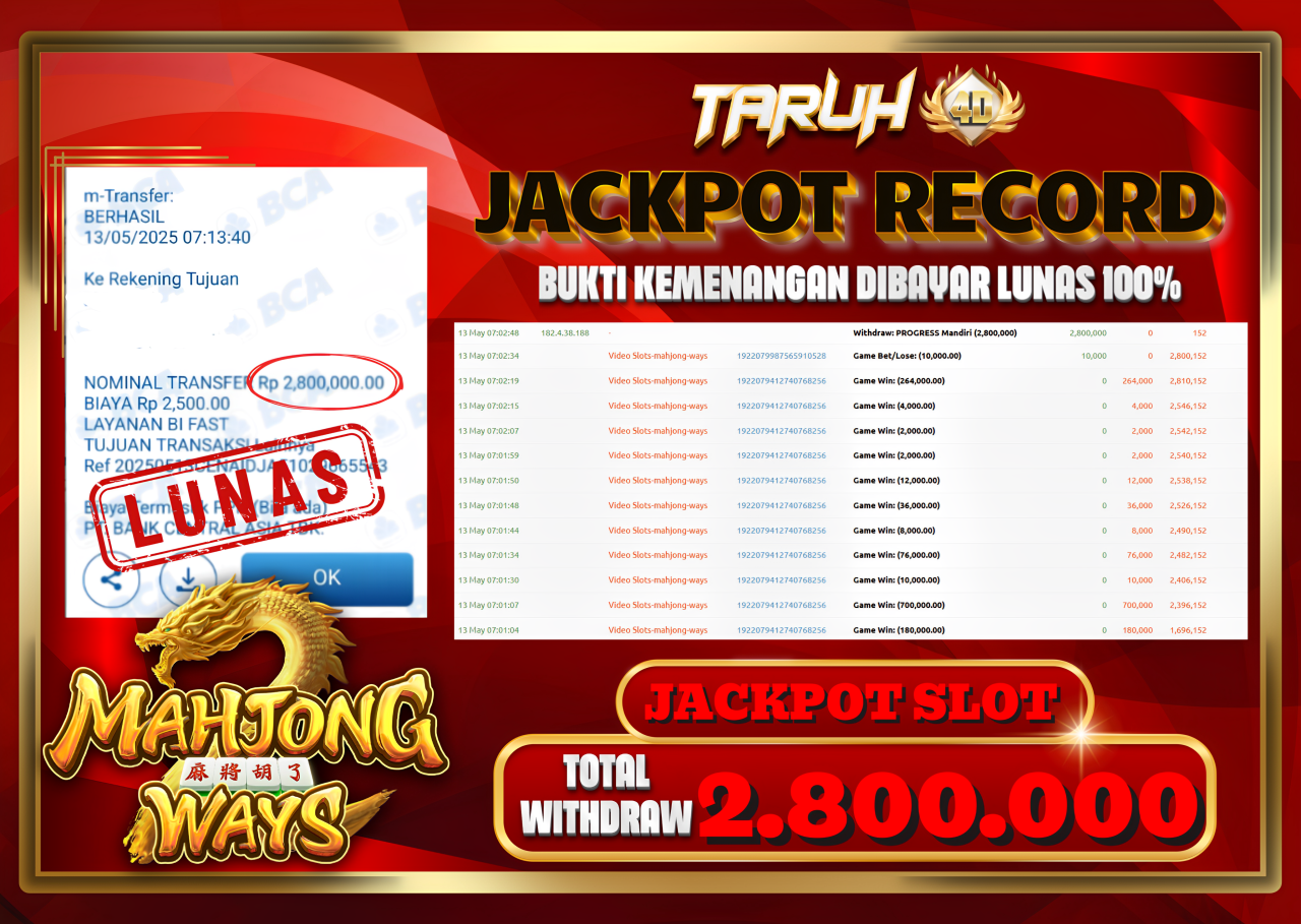 Selamat kepada User id : S****UL Telah berhasil mendapatkan kemenangan besar pada permainan slot MAHJONG WAYS kemenangan Sebesar Rp.2.800.000, Setelah mengisi formulir withdraw dengan kurung waktu hanya 5 – 10 menit pihak taruh4d sudah melakukan transfer kepada pemilik Userid dan dana sudah dapat di cairkan oleh pemenang. Bukti pembayaran yang kami berikan merupakan bukti pembayaran yang SAH / VALID yang langung di dapatkan melalui tanda transfer transaksi dari Bank yang di tuju.