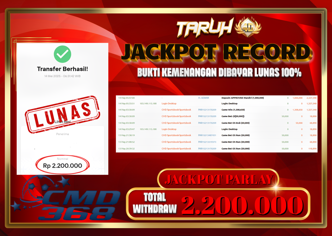 Selamat kepada User id : K****AR Telah berhasil mendapatkan kemenangan besar pada permainan parlay CMD368 kemenangan Sebesar Rp.2.200.000, Setelah mengisi formulir withdraw dengan kurung waktu hanya 5 – 10 menit pihak taruh4d sudah melakukan transfer kepada pemilik Userid dan dana sudah dapat di cairkan oleh pemenang. Bukti pembayaran yang kami berikan merupakan bukti pembayaran yang SAH / VALID yang langung di dapatkan melalui tanda transfer transaksi dari Bank yang di tuju.
