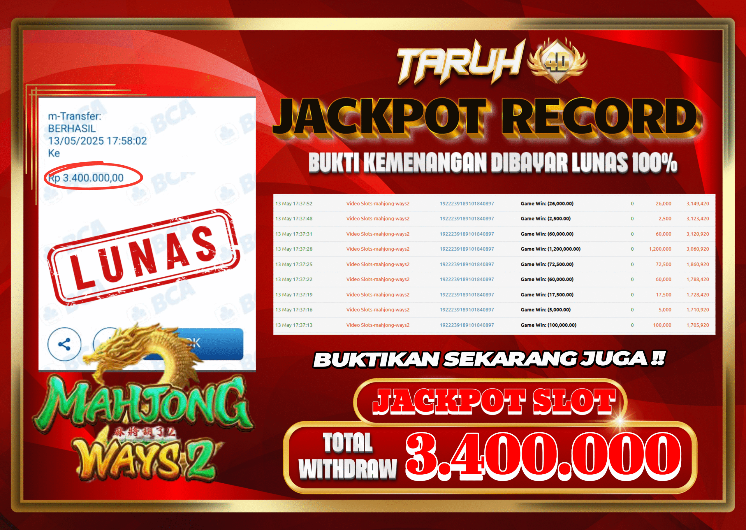 Selamat kepada User id : A****N7 Telah berhasil mendapatkan kemenangan besar pada permainan slot MAHJONG WAYS 2 kemenangan Sebesar Rp.3.400.000, Setelah mengisi formulir withdraw dengan kurung waktu hanya 5 – 10 menit pihak taruh4d sudah melakukan transfer kepada pemilik Userid dan dana sudah dapat di cairkan oleh pemenang. Bukti pembayaran yang kami berikan merupakan bukti pembayaran yang SAH / VALID yang langung di dapatkan melalui tanda transfer transaksi dari Bank yang di tuju.