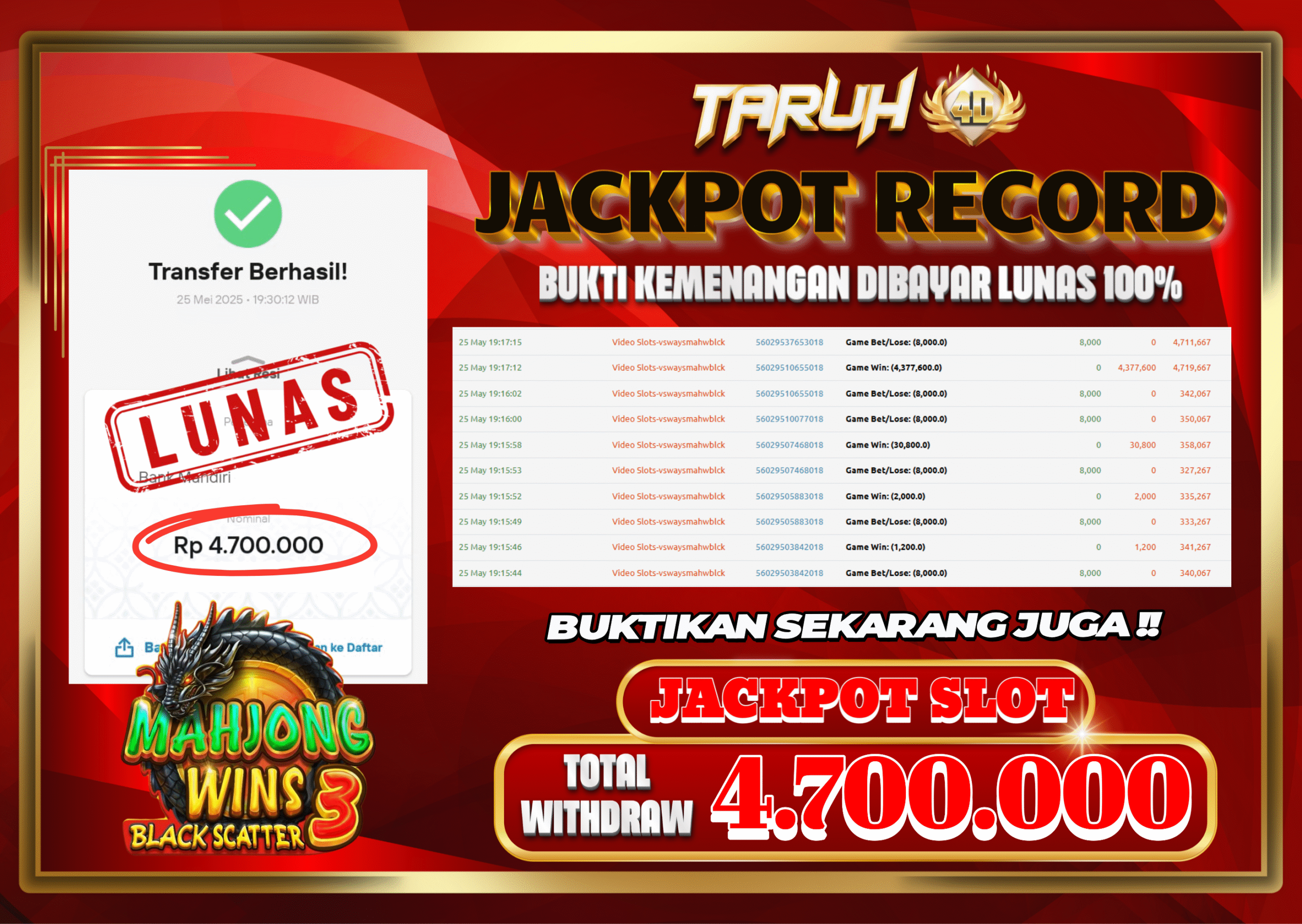 Selamat kepada User id : S****UL Telah berhasil mendapatkan kemenangan besar pada permainan slot MAHJONG WINS 3  kemenangan Sebesar Rp.4.700.000, Setelah mengisi formulir withdraw dengan kurung waktu hanya 5 – 10 menit pihak taruh4d sudah melakukan transfer kepada pemilik Userid dan dana sudah dapat di cairkan oleh pemenang. Bukti pembayaran yang kami berikan merupakan bukti pembayaran yang SAH / VALID yang langung di dapatkan melalui tanda transfer transaksi dari Bank yang di tuju.