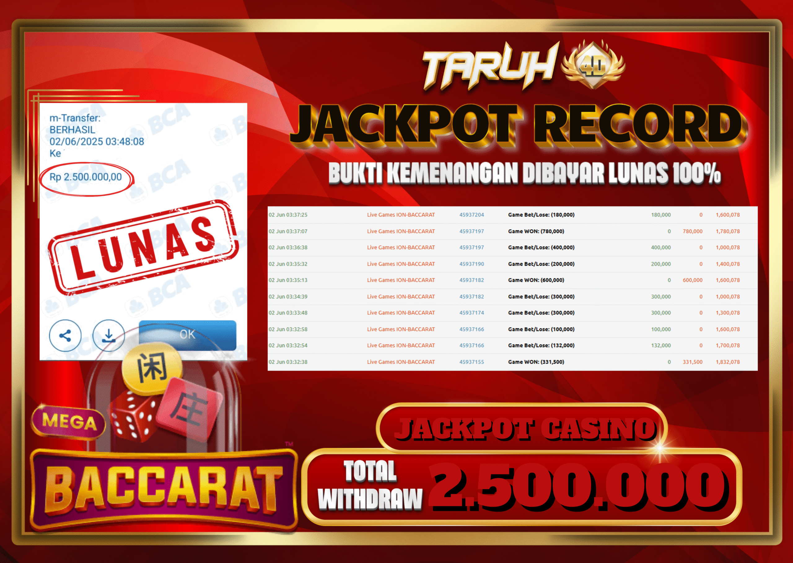 Selamat kepada User id : V****33 Telah berhasil mendapatkan kemenangan besar pada permainan LIVE GAMES ION BACCARAT kemenangan Sebesar Rp.2.500.000, Setelah mengisi formulir withdraw dengan kurung waktu hanya 5 – 10 menit pihak taruh4d sudah melakukan transfer kepada pemilik Userid dan dana sudah dapat di cairkan oleh pemenang. Bukti pembayaran yang kami berikan merupakan bukti pembayaran yang SAH / VALID yang langung di dapatkan melalui tanda transfer transaksi dari Bank yang di tuju.