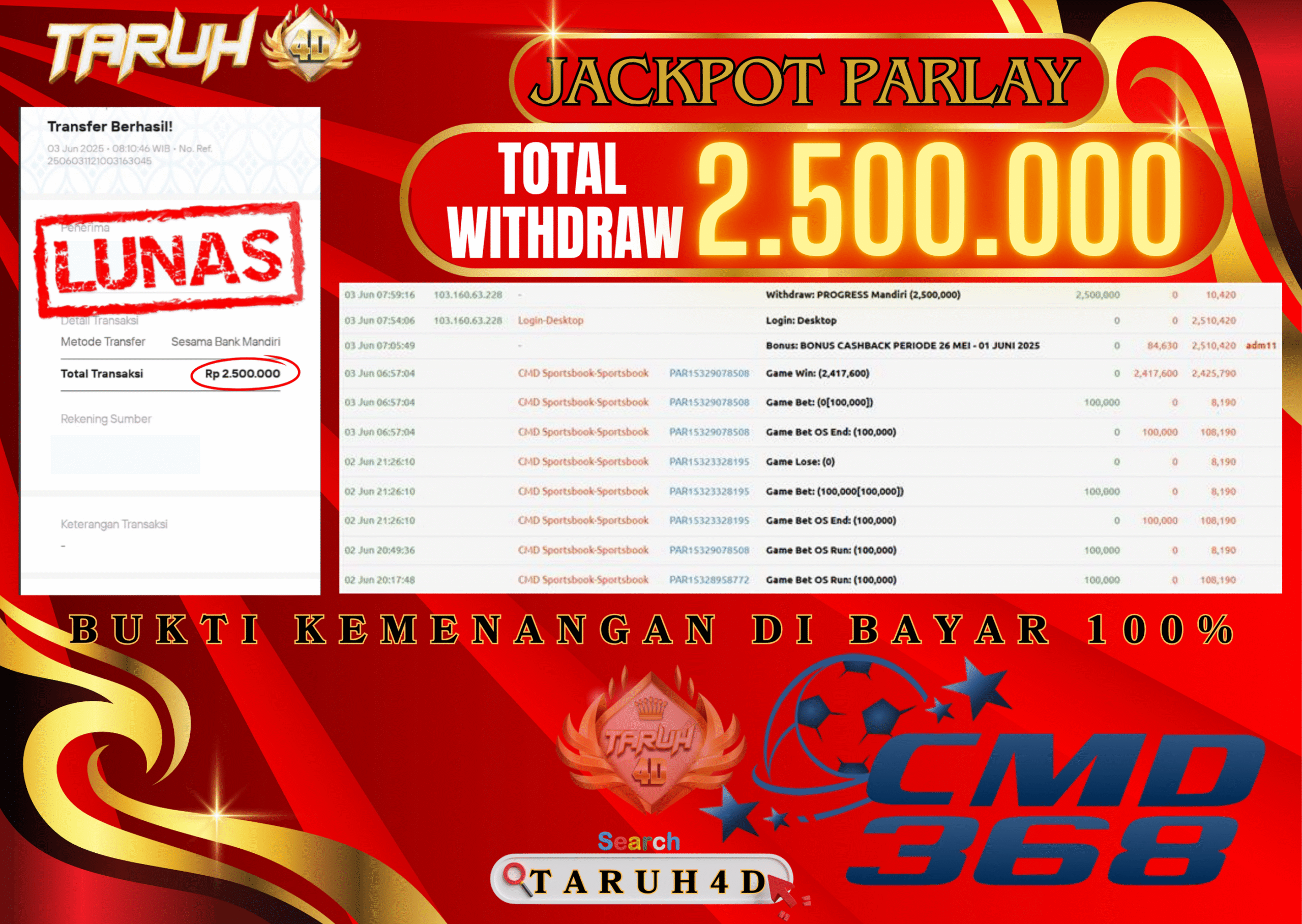 Selamat kepada User id : K****AR Telah berhasil mendapatkan kemenangan besar pada permainan parlay CMD368 kemenangan Sebesar Rp.2.500.000, Setelah mengisi formulir withdraw dengan kurung waktu hanya 5 – 10 menit pihak taruh4d sudah melakukan transfer kepada pemilik Userid dan dana sudah dapat di cairkan oleh pemenang. Bukti pembayaran yang kami berikan merupakan bukti pembayaran yang SAH / VALID yang langung di dapatkan melalui tanda transfer transaksi dari Bank yang di tuju.