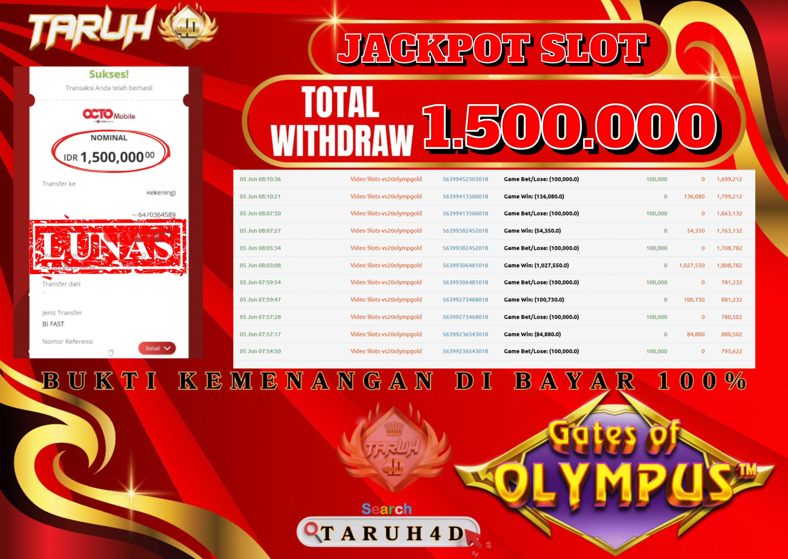 Selamat kepada User id : A****R1 Telah berhasil mendapatkan kemenangan besar pada permainan slot GATES OF OLYMPUS kemenangan Sebesar Rp.1.500.000, Setelah mengisi formulir withdraw dengan kurung waktu hanya 5 – 10 menit pihak taruh4d sudah melakukan transfer kepada pemilik Userid dan dana sudah dapat di cairkan oleh pemenang. Bukti pembayaran yang kami berikan merupakan bukti pembayaran yang SAH / VALID yang langung di dapatkan melalui tanda transfer transaksi dari Bank yang di tuju.
