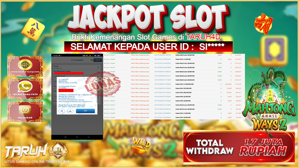 Selamat kepada User id : S****UL Telah berhasil mendapatkan kemenangan besar pada permainan slot MAHJONG WAYS 2 kemenangan Sebesar Rp.1.700.000, Setelah mengisi formulir withdraw dengan kurung waktu hanya 5 – 10 menit pihak taruh4d sudah melakukan transfer kepada pemilik Userid dan dana sudah dapat di cairkan oleh pemenang. Bukti pembayaran yang kami berikan merupakan bukti pembayaran yang SAH / VALID yang langung di dapatkan melalui tanda transfer transaksi dari Bank yang di tuju.