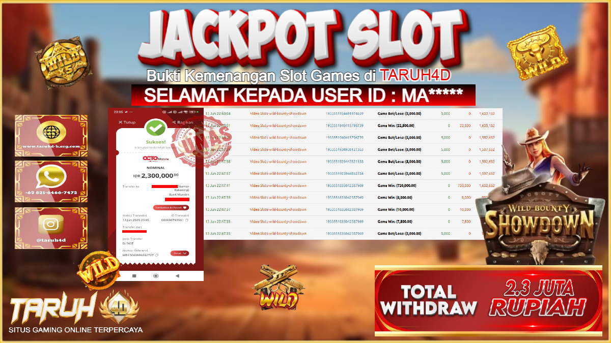 Selamat kepada User id : MA***** Telah berhasil mendapatkan kemenangan besar pada permainan slot SWEET BONANZA  kemenangan Sebesar Rp.2.300.000, Setelah mengisi formulir withdraw dengan kurung waktu hanya 5 – 10 menit pihak taruh4d sudah melakukan transfer kepada pemilik Userid dan dana sudah dapat di cairkan oleh pemenang. Bukti pembayaran yang kami berikan merupakan bukti pembayaran yang SAH / VALID yang langung di dapatkan melalui tanda transfer transaksi dari Bank yang di tuju.