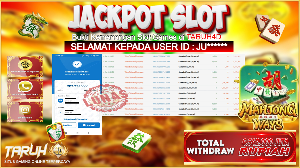 Selamat kepada User id : JU***** Telah berhasil mendapatkan kemenangan besar pada permainan slot MAHJONG WAYS kemenangan Sebesar Rp.4.542.000, Setelah mengisi formulir withdraw dengan kurung waktu hanya 5 – 10 menit pihak taruh4d sudah melakukan transfer kepada pemilik Userid dan dana sudah dapat di cairkan oleh pemenang. Bukti pembayaran yang kami berikan merupakan bukti pembayaran yang SAH / VALID yang langung di dapatkan melalui tanda transfer transaksi dari Bank yang di tuju.
