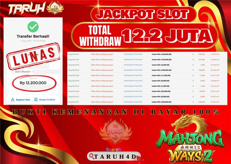 Selamat kepada User id : SI***** Telah berhasil mendapatkan kemenangan besar pada permainan slot MAHJONG WAYS 2 kemenangan Sebesar Rp.12.000.000, Setelah mengisi formulir withdraw dengan kurung waktu hanya 5 – 10 menit pihak taruh4d sudah melakukan transfer kepada pemilik Userid dan dana sudah dapat di cairkan oleh pemenang. Bukti pembayaran yang kami berikan merupakan bukti pembayaran yang SAH / VALID yang langung di dapatkan melalui tanda transfer transaksi dari Bank yang di tuju.
