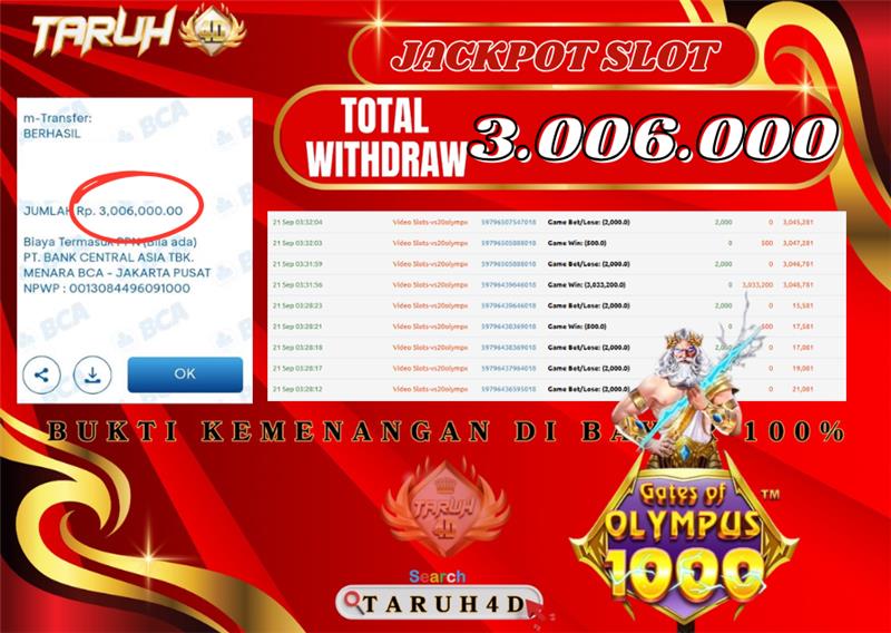 Selamat kepada User id : RI***** Telah berhasil mendapatkan kemenangan besar pada permainan slot GATES OF OLYMPUS 1000 kemenangan Sebesar Rp.3.006.000, Setelah mengisi formulir withdraw dengan kurung waktu hanya 5 – 10 menit pihak taruh4d sudah melakukan transfer kepada pemilik Userid dan dana sudah dapat di cairkan oleh pemenang. Bukti pembayaran yang kami berikan merupakan bukti pembayaran yang SAH / VALID yang langung di dapatkan melalui tanda transfer transaksi dari Bank yang di tuju.