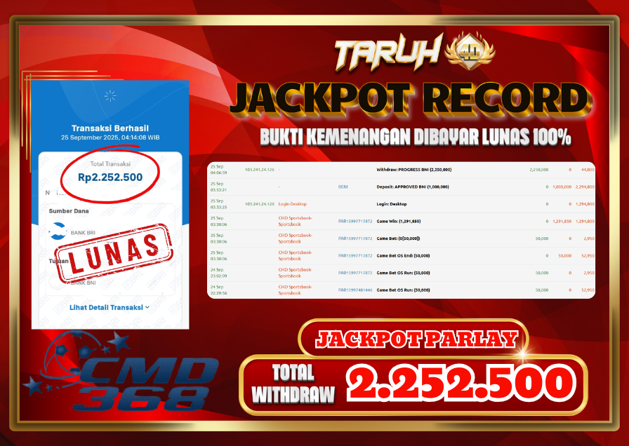 Selamat kepada User id : CY***** Telah berhasil mendapatkan kemenangan besar pada permainan PARLAY CMD368kemenangan Sebesar Rp.2.252.000, Setelah mengisi formulir withdraw dengan kurung waktu hanya 5 – 10 menit pihak taruh4d sudah melakukan transfer kepada pemilik Userid dan dana sudah dapat di cairkan oleh pemenang. Bukti pembayaran yang kami berikan merupakan bukti pembayaran yang SAH / VALID yang langung di dapatkan melalui tanda transfer transaksi dari Bank yang di tuju.