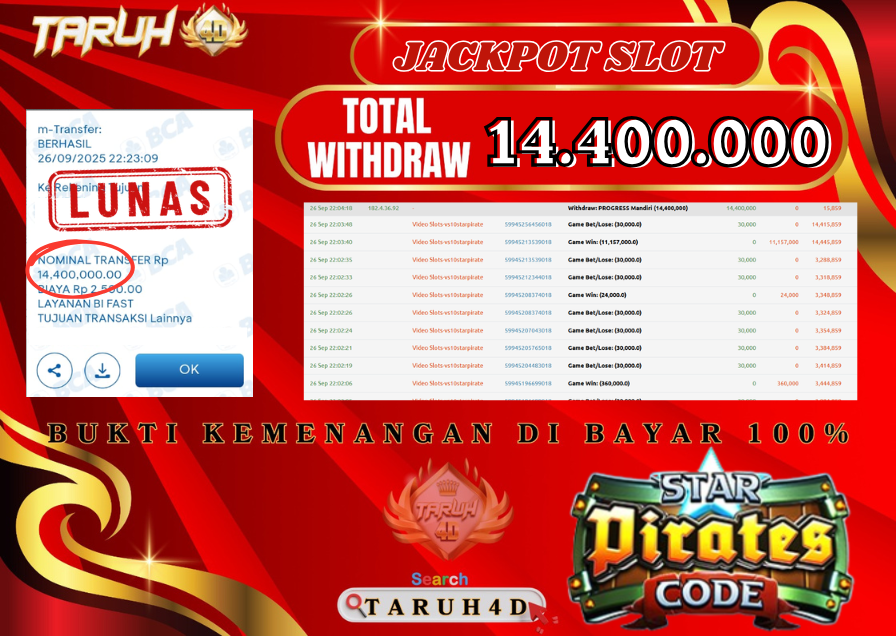 Selamat kepada User id : SI***** Telah berhasil mendapatkan kemenangan besar pada permainan slot STAR PIRATES CODE kemenangan Sebesar Rp.14.400.000, Setelah mengisi formulir withdraw dengan kurung waktu hanya 5 – 10 menit pihak taruh4d sudah melakukan transfer kepada pemilik Userid dan dana sudah dapat di cairkan oleh pemenang. Bukti pembayaran yang kami berikan merupakan bukti pembayaran yang SAH / VALID yang langung di dapatkan melalui tanda transfer transaksi dari Bank yang di tuju.