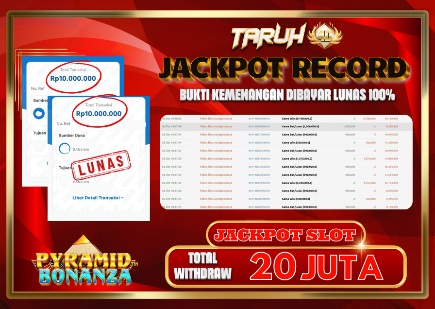 Selamat kepada User id : DU***** Telah berhasil mendapatkan kemenangan besar pada permainan slot PYRAMID BONANZA kemenangan Sebesar Rp.20.000.000, Setelah mengisi formulir withdraw dengan kurung waktu hanya 5 – 10 menit pihak taruh4d sudah melakukan transfer kepada pemilik Userid dan dana sudah dapat di cairkan oleh pemenang. Bukti pembayaran yang kami berikan merupakan bukti pembayaran yang SAH / VALID yang langung di dapatkan melalui tanda transfer transaksi dari Bank yang di tuju.