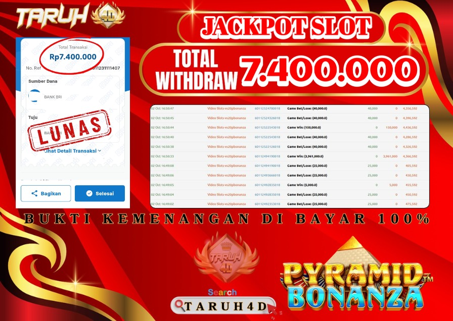 elamat kepada User id : DU***** Telah berhasil mendapatkan kemenangan besar pada permainan slot PYRAMID BONANZA kemenangan Sebesar Rp.7.400.000, Setelah mengisi formulir withdraw dengan kurung waktu hanya 5 – 10 menit pihak taruh4d sudah melakukan transfer kepada pemilik Userid dan dana sudah dapat di cairkan oleh pemenang. Bukti pembayaran yang kami berikan merupakan bukti pembayaran yang SAH / VALID yang langung di dapatkan melalui tanda transfer transaksi dari Bank yang di tuju.