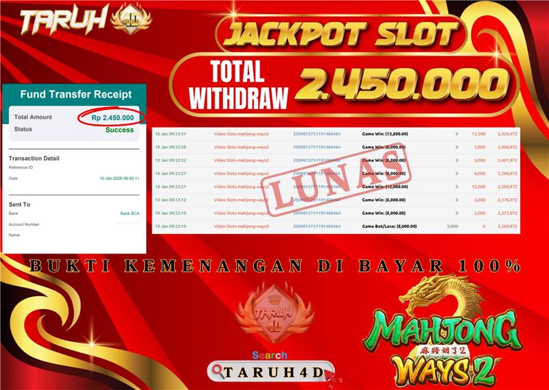 Selamat kepada User id : GI***** Telah berhasil mendapatkan kemenangan besar pada permainan slot MAHJONG WAYS kemenangan Sebesar Rp.2.450.000, Setelah mengisi formulir withdraw dengan kurung waktu hanya 5 – 10 menit pihak taruh4d sudah melakukan transfer kepada pemilik Userid dan dana sudah dapat di cairkan oleh pemenang. Bukti pembayaran yang kami berikan merupakan bukti pembayaran yang SAH / VALID yang langung di dapatkan melalui tanda transfer transaksi dari Bank yang di tuju.