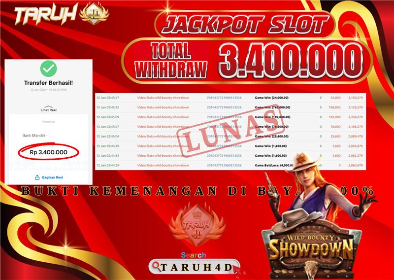 Selamat kepada User id : MAM***** Telah berhasil mendapatkan kemenangan besar pada permainan slot WILD BOUNTY SHOWDOWN kemenangan Sebesar Rp.3.400.000, Setelah mengisi formulir withdraw dengan kurung waktu hanya 5 – 10 menit pihak taruh4d sudah melakukan transfer kepada pemilik Userid dan dana sudah dapat di cairkan oleh pemenang. Bukti pembayaran yang kami berikan merupakan bukti pembayaran yang SAH / VALID yang langung di dapatkan melalui tanda transfer transaksi dari Bank yang di tuju.