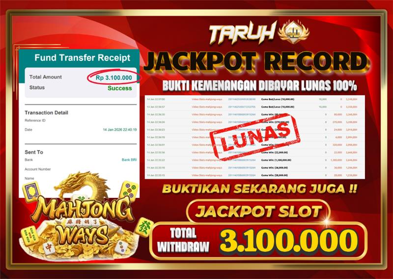 Selamat kepada User id : CA***** Telah berhasil mendapatkan kemenangan besar pada permainan slot MAHJONG WAYS kemenangan Sebesar Rp.3.100.000, Setelah mengisi formulir withdraw dengan kurung waktu hanya 5 – 10 menit pihak taruh4d sudah melakukan transfer kepada pemilik Userid dan dana sudah dapat di cairkan oleh pemenang. Bukti pembayaran yang kami berikan merupakan bukti pembayaran yang SAH / VALID yang langung di dapatkan melalui tanda transfer transaksi dari Bank yang di tuju.