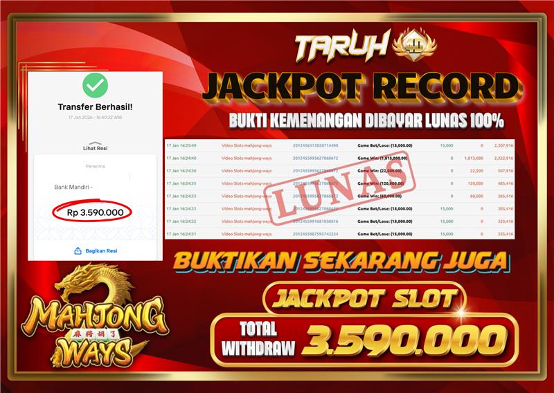 Selamat kepada User id : SI***** Telah berhasil mendapatkan kemenangan besar pada permainan slot MAHJONG WAYS kemenangan Sebesar Rp.3.590.000, Setelah mengisi formulir withdraw dengan kurung waktu hanya 5 – 10 menit pihak taruh4d sudah melakukan transfer kepada pemilik Userid dan dana sudah dapat di cairkan oleh pemenang. Bukti pembayaran yang kami berikan merupakan bukti pembayaran yang SAH / VALID yang langung di dapatkan melalui tanda transfer transaksi dari Bank yang di tuju.
