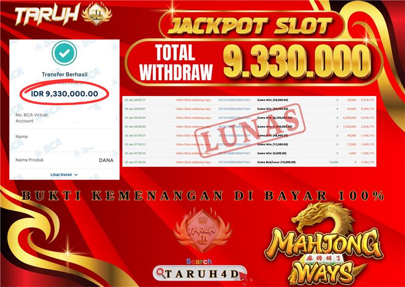Selamat kepada User id : NA***** Telah berhasil mendapatkan kemenangan besar pada permainan slot MAHJONG WAYS kemenangan Sebesar Rp.9.330.000, Setelah mengisi formulir withdraw dengan kurung waktu hanya 5 – 10 menit pihak taruh4d sudah melakukan transfer kepada pemilik Userid dan dana sudah dapat di cairkan oleh pemenang. Bukti pembayaran yang kami berikan merupakan bukti pembayaran yang SAH / VALID yang langung di dapatkan melalui tanda transfer transaksi dari Bank yang di tuju.