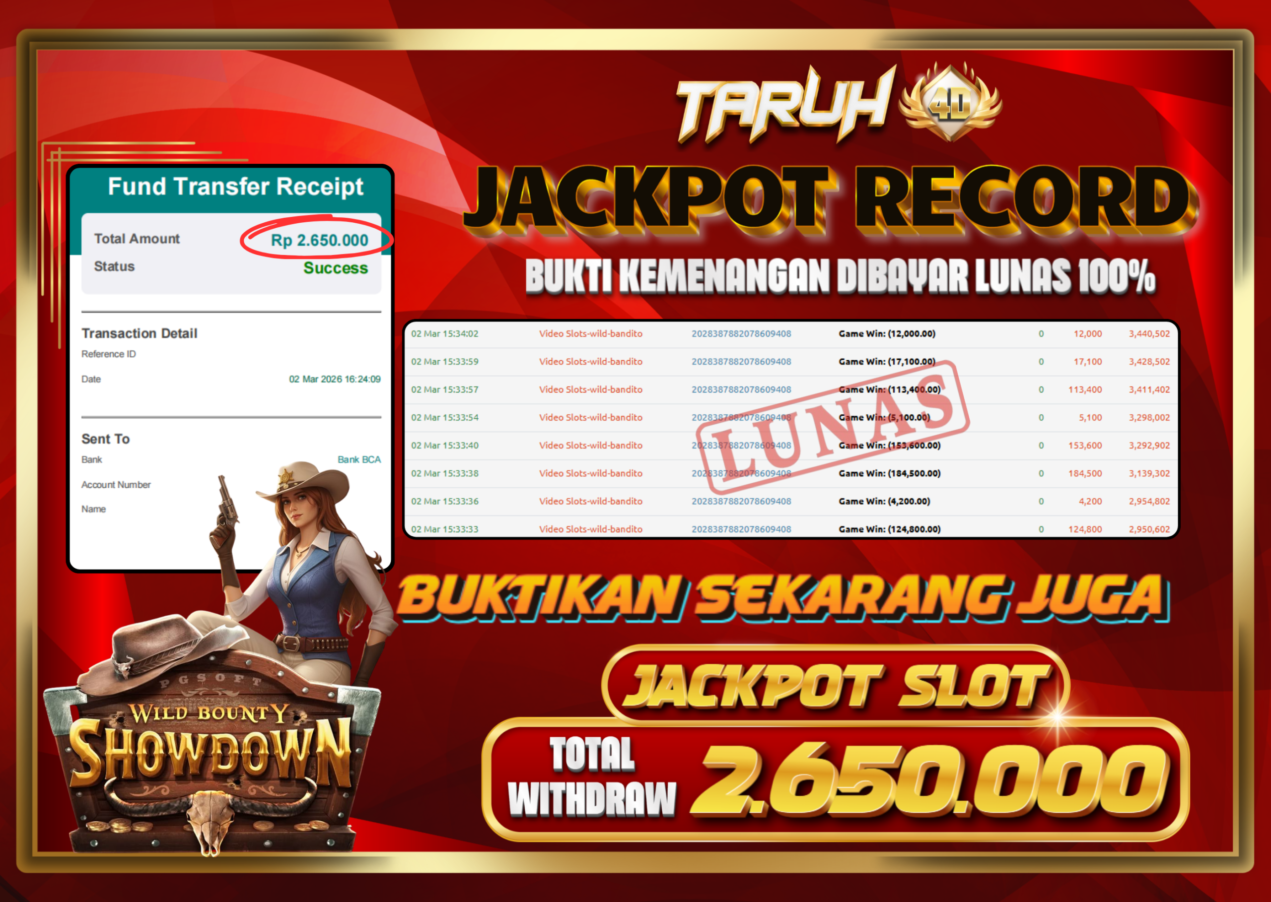 Selamat kepada User id : SA***** Telah berhasil mendapatkan kemenangan besar pada permainan slot WILD BOUNTY SHOWDOWN  kemenangan Sebesar Rp.2.650.000, Setelah mengisi formulir withdraw dengan kurung waktu hanya 5 – 10 menit pihak taruh4d sudah melakukan transfer kepada pemilik Userid dan dana sudah dapat di cairkan oleh pemenang. Bukti pembayaran yang kami berikan merupakan bukti pembayaran yang SAH / VALID yang langung di dapatkan melalui tanda transfer transaksi dari Bank yang di tuju.