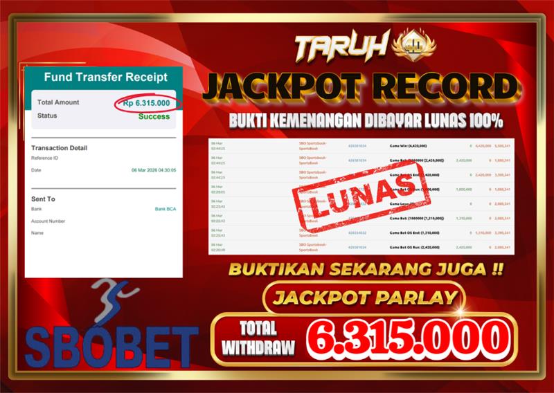 Selamat kepada User id : BE***** Telah berhasil mendapatkan kemenangan besar pada permainan slot SPORTBOOK SBOBET kemenangan Sebesar Rp.6.315.000, Setelah mengisi formulir withdraw dengan kurung waktu hanya 5 – 10 menit pihak taruh4d sudah melakukan transfer kepada pemilik Userid dan dana sudah dapat di cairkan oleh pemenang. Bukti pembayaran yang kami berikan merupakan bukti pembayaran yang SAH / VALID yang langung di dapatkan melalui tanda transfer transaksi dari Bank yang di tuju.