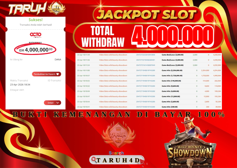Selamat kepada User id : RI***** Telah berhasil mendapatkan kemenangan besar pada permainan slot WILD BOUNTY SHOWDOWN kemenangan Sebesar Rp.4.000.000, Setelah mengisi formulir withdraw dengan kurung waktu hanya 5 – 10 menit pihak taruh4d sudah melakukan transfer kepada pemilik Userid dan dana sudah dapat di cairkan oleh pemenang. Bukti pembayaran yang kami berikan merupakan bukti pembayaran yang SAH / VALID yang langung di dapatkan melalui tanda transfer transaksi dari Bank yang di tuju.