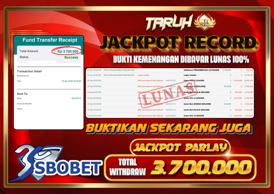 Selamat kepada User id : BE***** Telah berhasil mendapatkan kemenangan besar pada permainan slot PARLAY SBOBET kemenangan Sebesar Rp.3.700.000, Setelah mengisi formulir withdraw dengan kurung waktu hanya 5 – 10 menit pihak taruh4d sudah melakukan transfer kepada pemilik Userid dan dana sudah dapat di cairkan oleh pemenang. Bukti pembayaran yang kami berikan merupakan bukti pembayaran yang SAH / VALID yang langung di dapatkan melalui tanda transfer transaksi dari Bank yang di tuju.