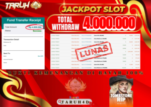 Selamat kepada User id : DO***** Telah berhasil mendapatkan kemenangan besar pada permainan slot TOMBSTONE RIP NOLIMIT CITY kemenangan Sebesar Rp.4.000.000, Setelah mengisi formulir withdraw dengan kurung waktu hanya 5 – 10 menit pihak taruh4d sudah melakukan transfer kepada pemilik Userid dan dana sudah dapat di cairkan oleh pemenang. Bukti pembayaran yang kami berikan merupakan bukti pembayaran yang SAH / VALID yang langung di dapatkan…